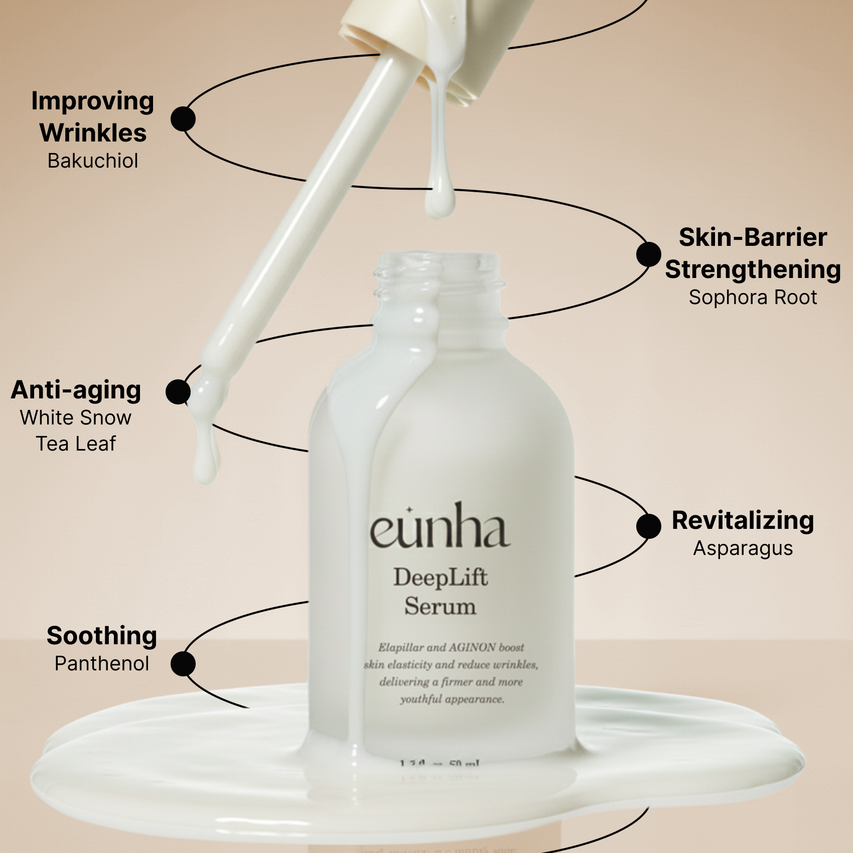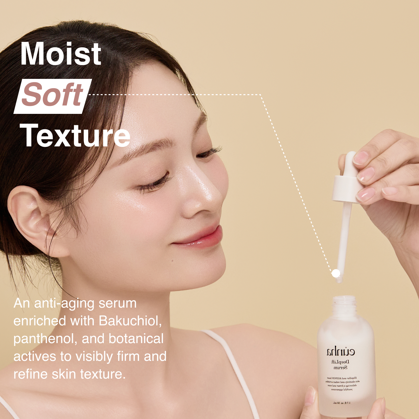 Bakuchiol supports wrinkle care, elasticity, lifting, and firming. Panthenol hydrates and reinforces the skin barrier for smoother, resilient skin.